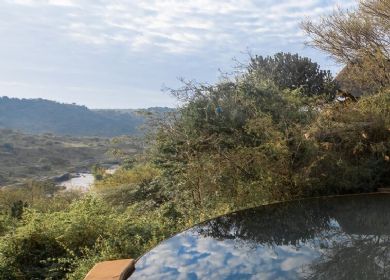 A haven of luxury in the bush, guests will immediately feel at home on arrival, warmly welcomed by the friendly and attentive staff. The comfortable sitting room with well-stocked bar and elegant dining area extend out to a large, comfortably furnished terrace. Here, guests can enjoy a sunny breakfast al fresco and watch the busy goings-on at the waterhole below, or they can choose to relax by the picturesque infinity pool and enjoy the magnificent views over the distant plains.